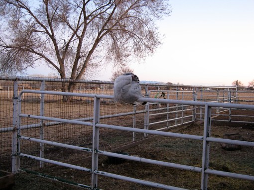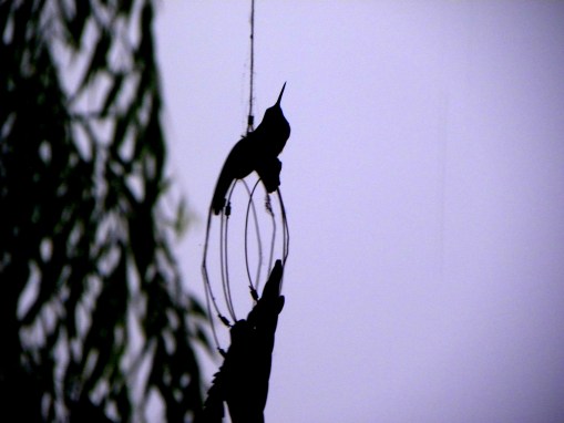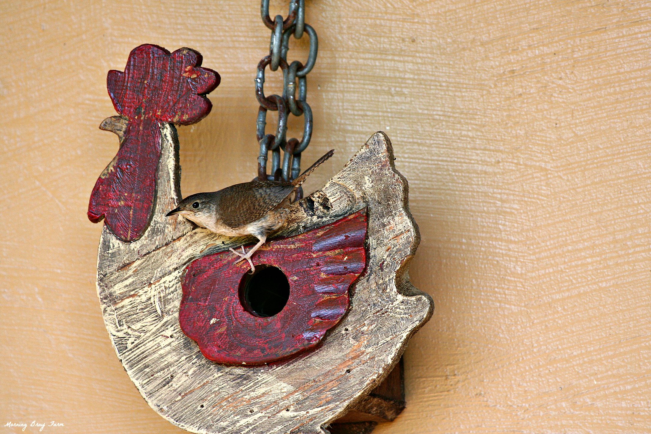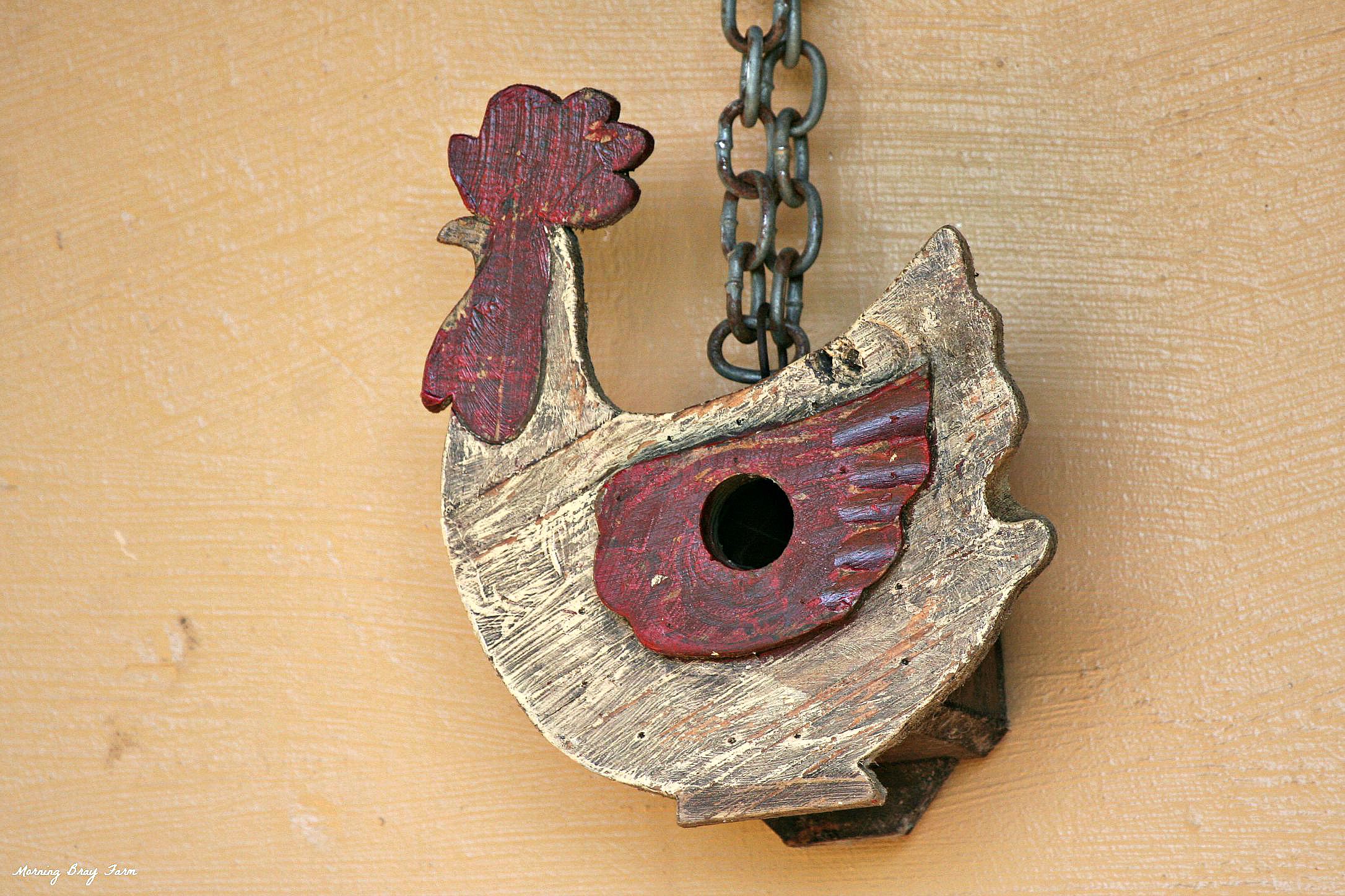This rooster house was kitchen decor in Albuquerque. I couldn’t find a place for it here, so I stuck it up on the wall just outside our kitchen door. I never thought anyone would actually want to live in it.