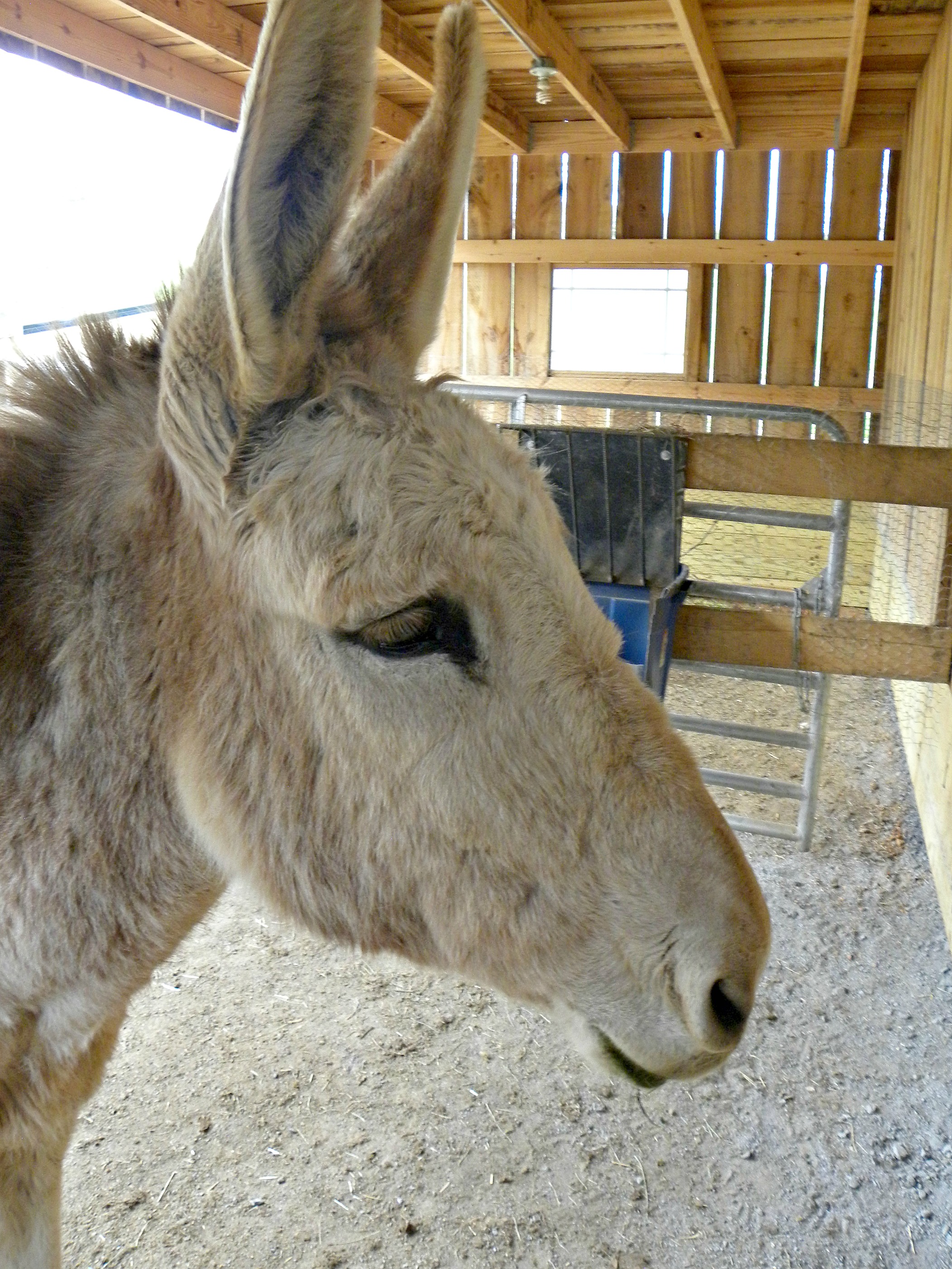 She has free range of the entire farm, all the time. She coexists with the dogs. She coexists with the donkeys. She never gets penned up and she keeps her own schedule.