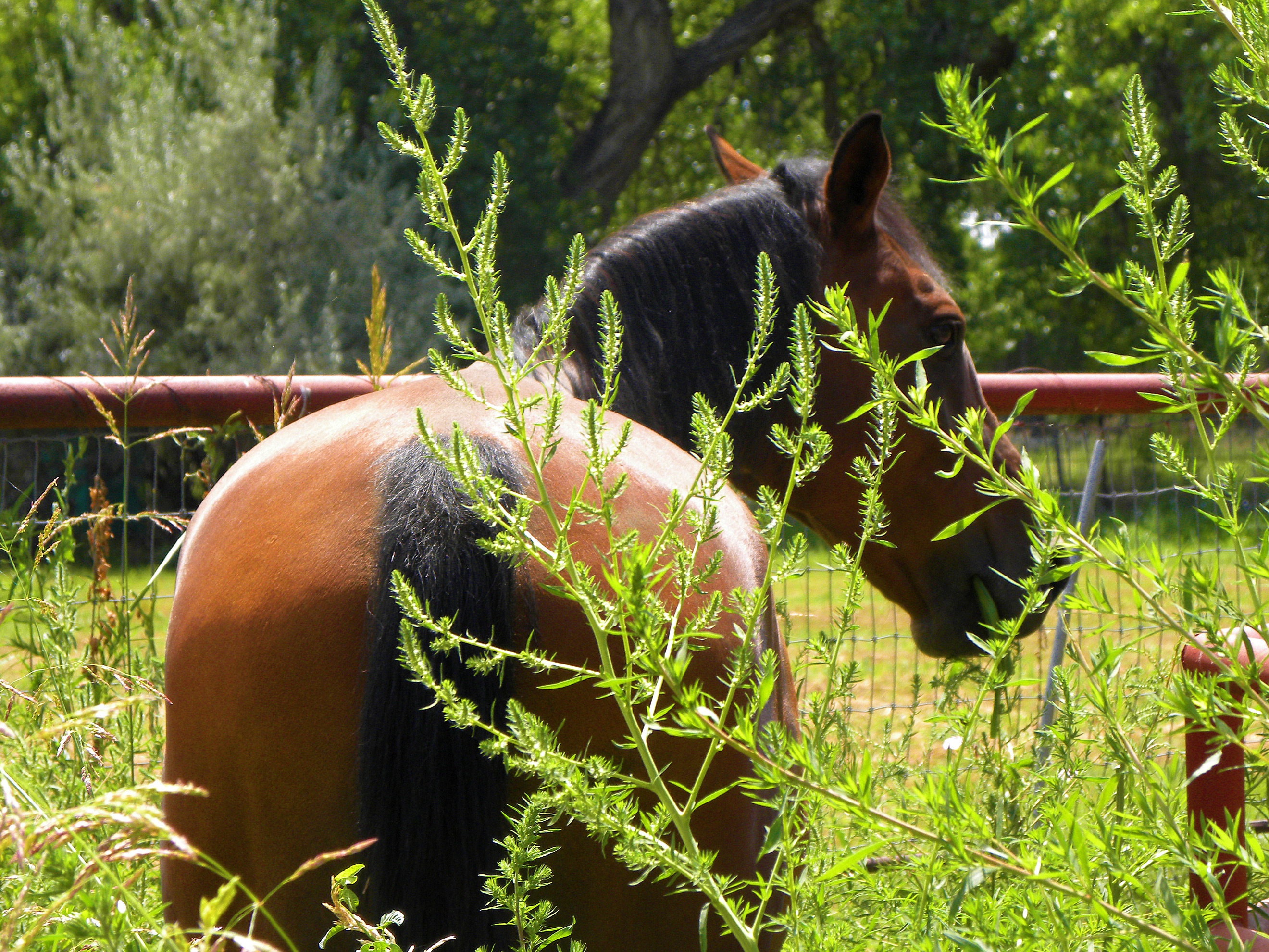 After a delicious lunch on the porch – while watching the burro brothers and Bernard gallop past in single file – we all took a walk in the pasture. Bernard made himself completely at home and led the way.