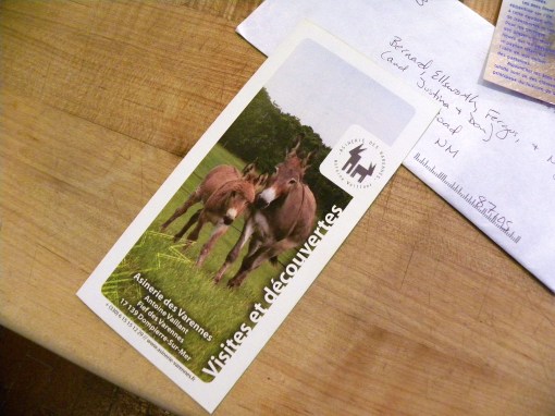 And then, goodness! Vicki said she saw this brochure and picked it up, but only as she was mailing it to us did she read it. They are keeping donkeys for their milk!  The brochure says that visitors can taste the milk, and that they make skin-care products, including soap, from the milk. As Vicki said, “Who knew??”