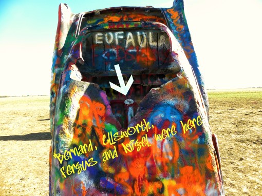 It’s a monument to the American dream on Route 66, pointed west.  The cars are buried in chronological order, from a 1949 Club Coupe to a 1963 Sedan de Ville.