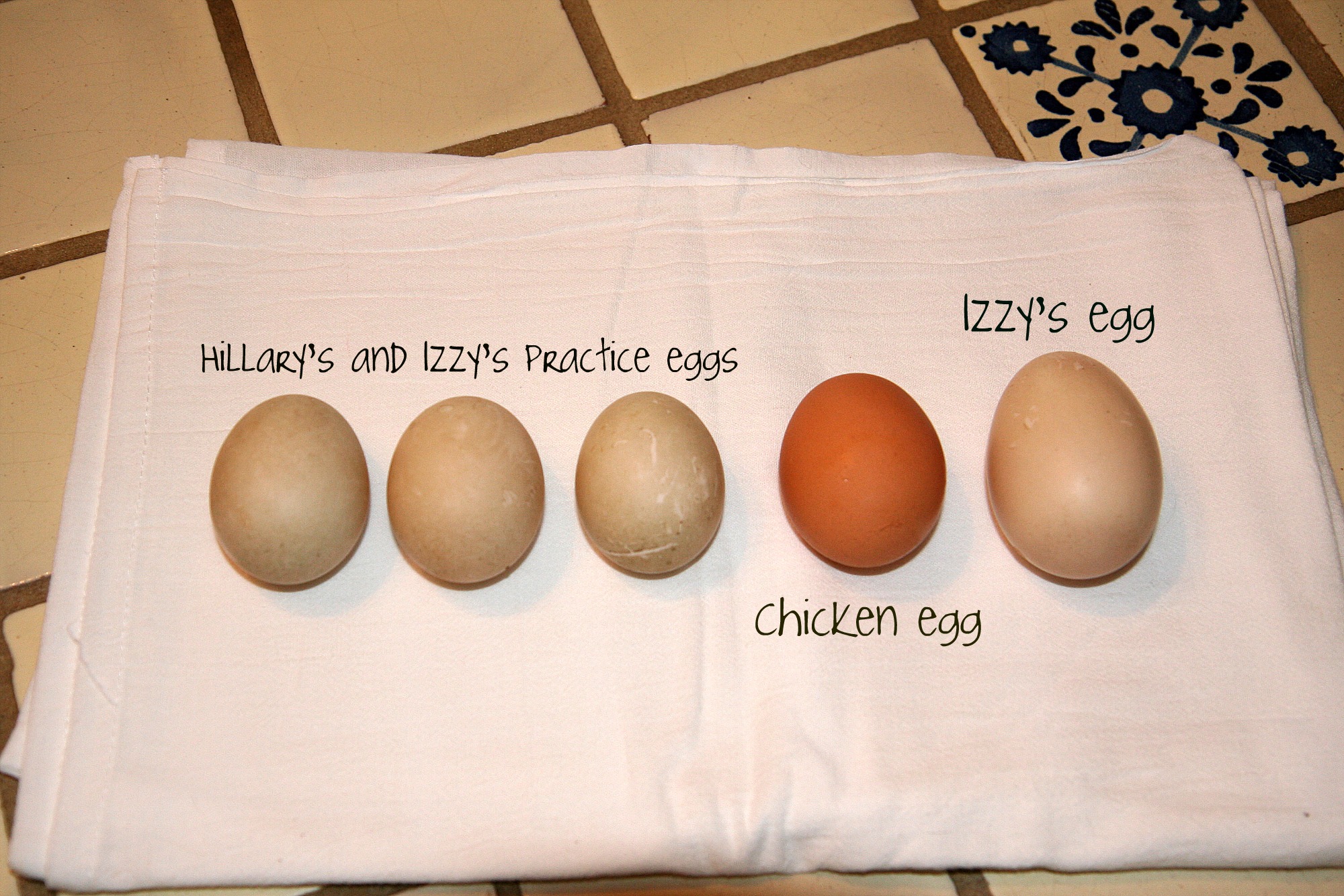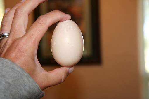 Once Izzy was out in the pasture being a duck, I collected the eggs and took them into the house. The three smaller eggs were cold, but the large egg was warm. I figured that means Izzy had just laid it.