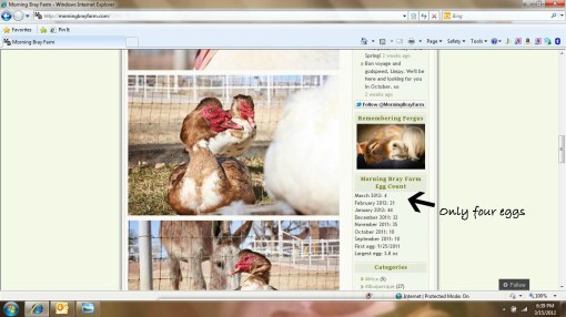 If you’re one of the minority out there who actually checks the Morning Bray Farm egg counter, you might have noticed a recent drop in the number of eggs that Emmy and Izzy have been laying.