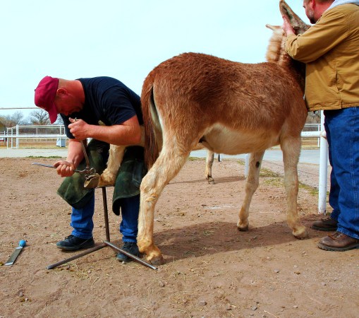 Each time Shorty initially tried to pick up Fergus’s first front foot, Fergus got up on his hind legs and/or got himself away from Shorty and Don. Fergus had a bit of a wild look in his eyes and seriously wasn’t having any of it. While Bernard and Ellsworth each have had their moments, it has never been like this.