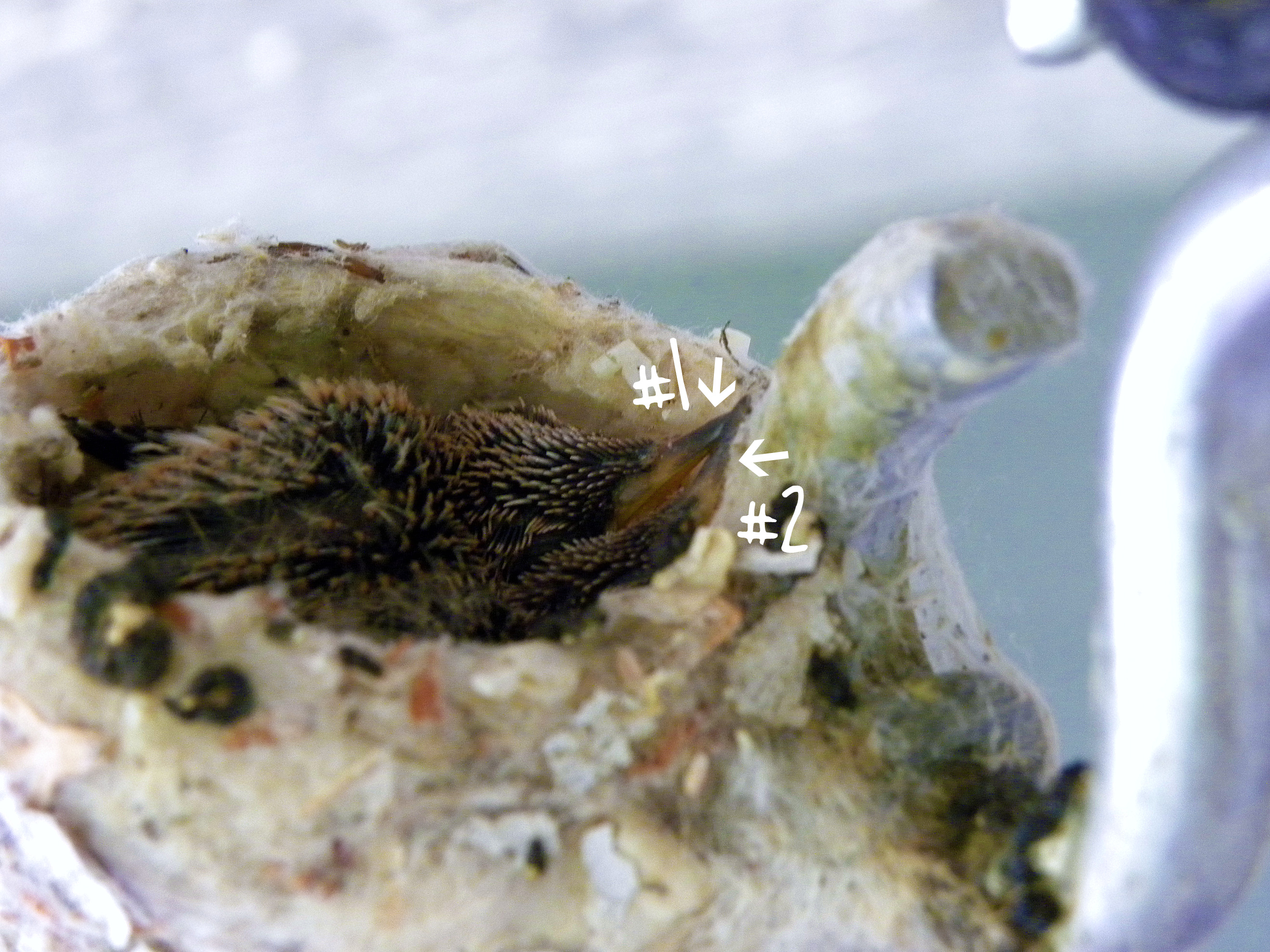 You might have to click on the photo to get a better look. I have pointed the arrows at their little beaks.