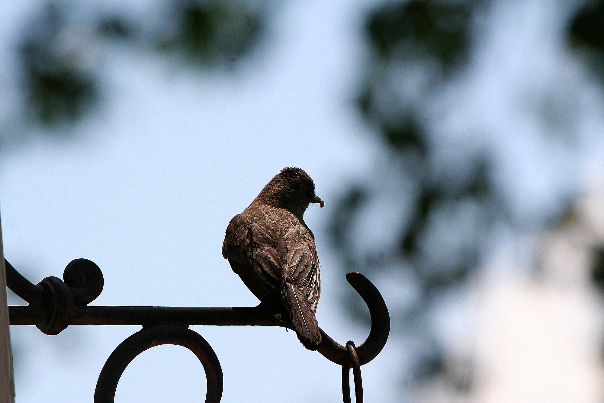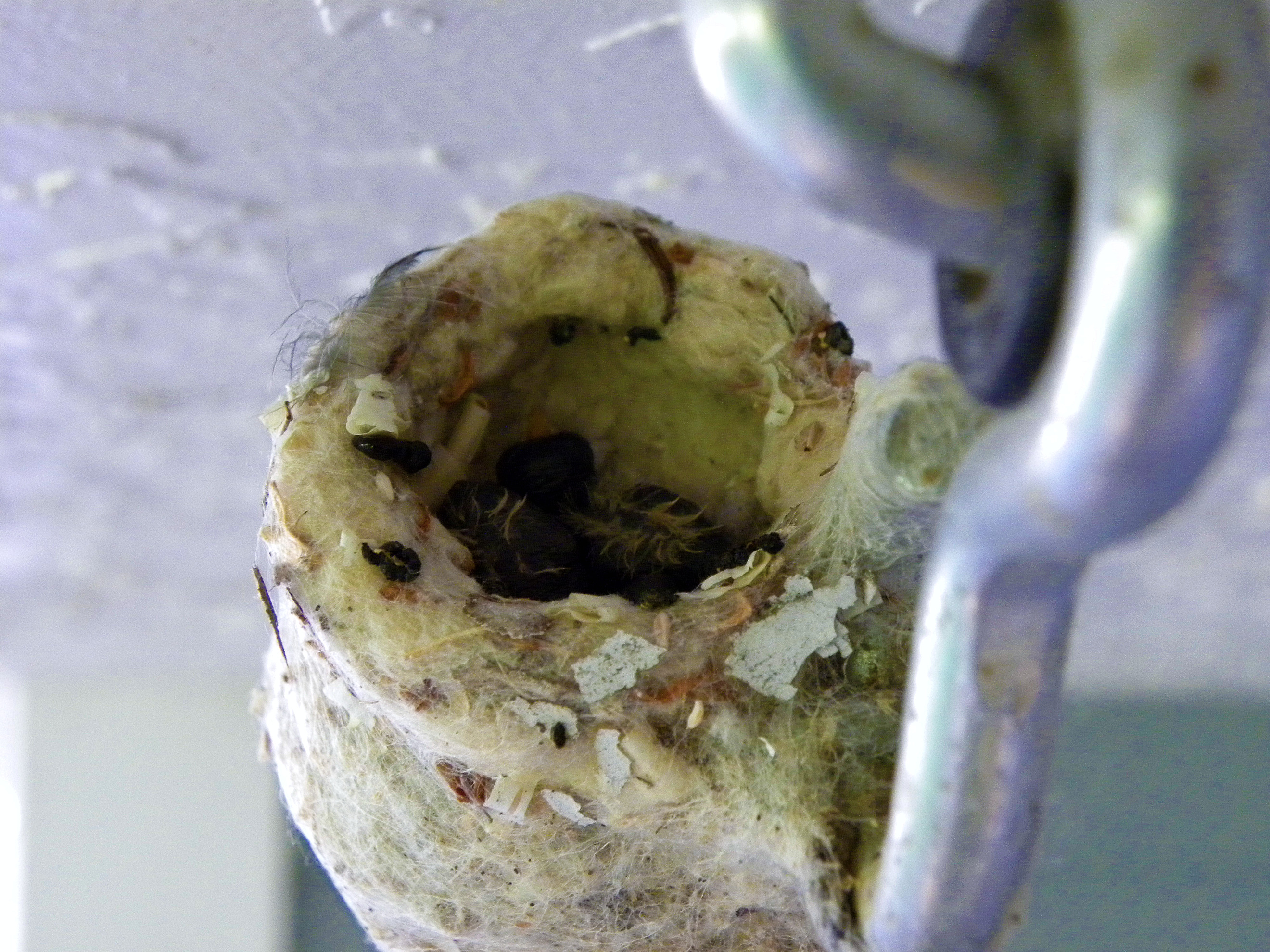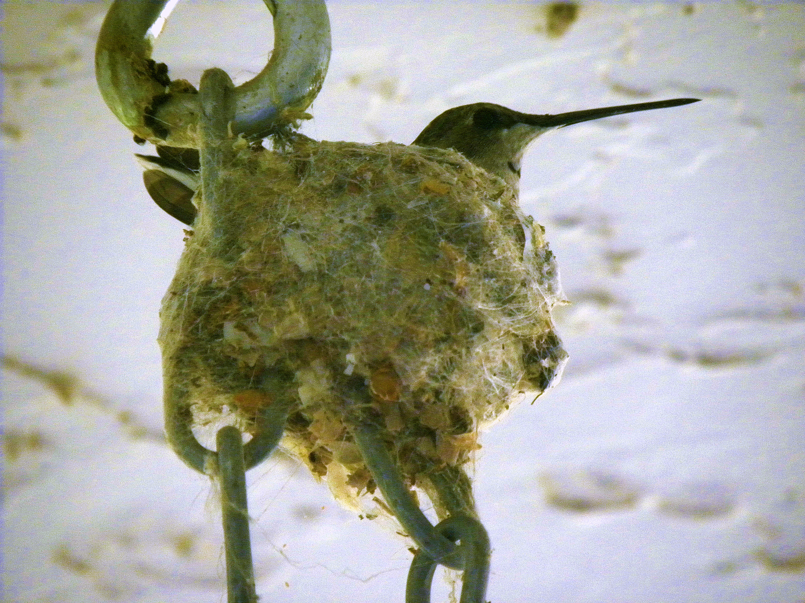 There has been more activity at the nest outside our kitchen window this past week. When we looked out yesterday, we watched as a hummingbird appeared to be feeding something in the nest. This picture was taken through the kitchen window: