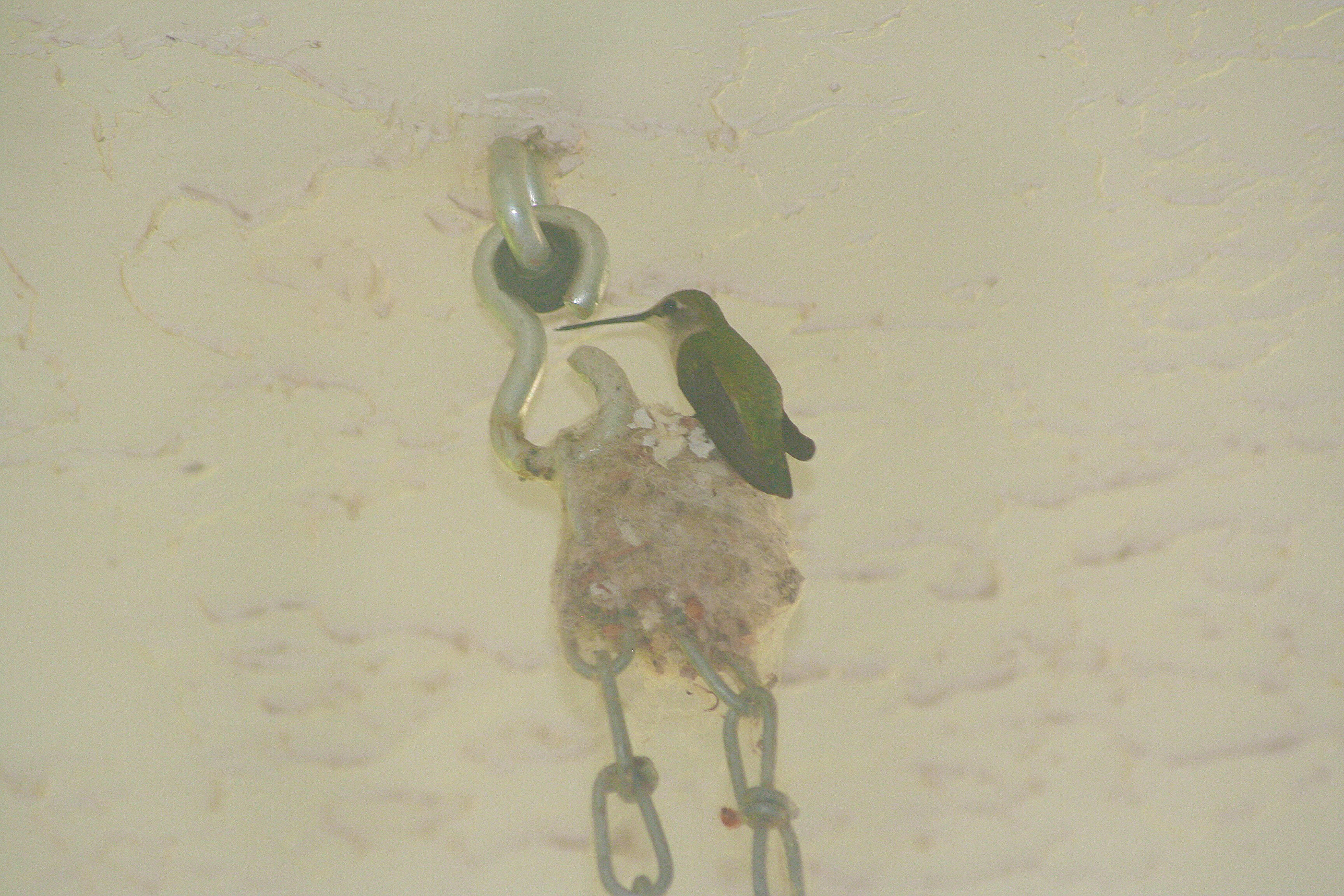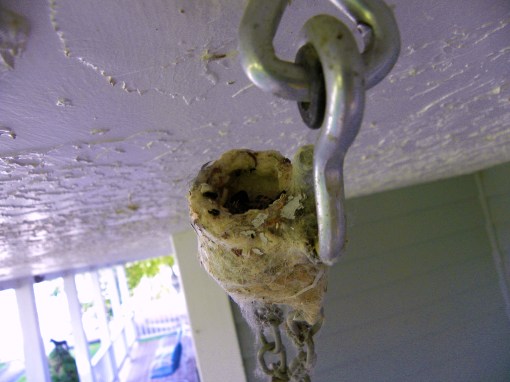 Right outside our kitchen window, a hummingbird sits in her nest. The nest is leftover from last year and was built on top of one of our porch swing chains. To give you some perspective, not much more than a quarter would fit easily into the nest.