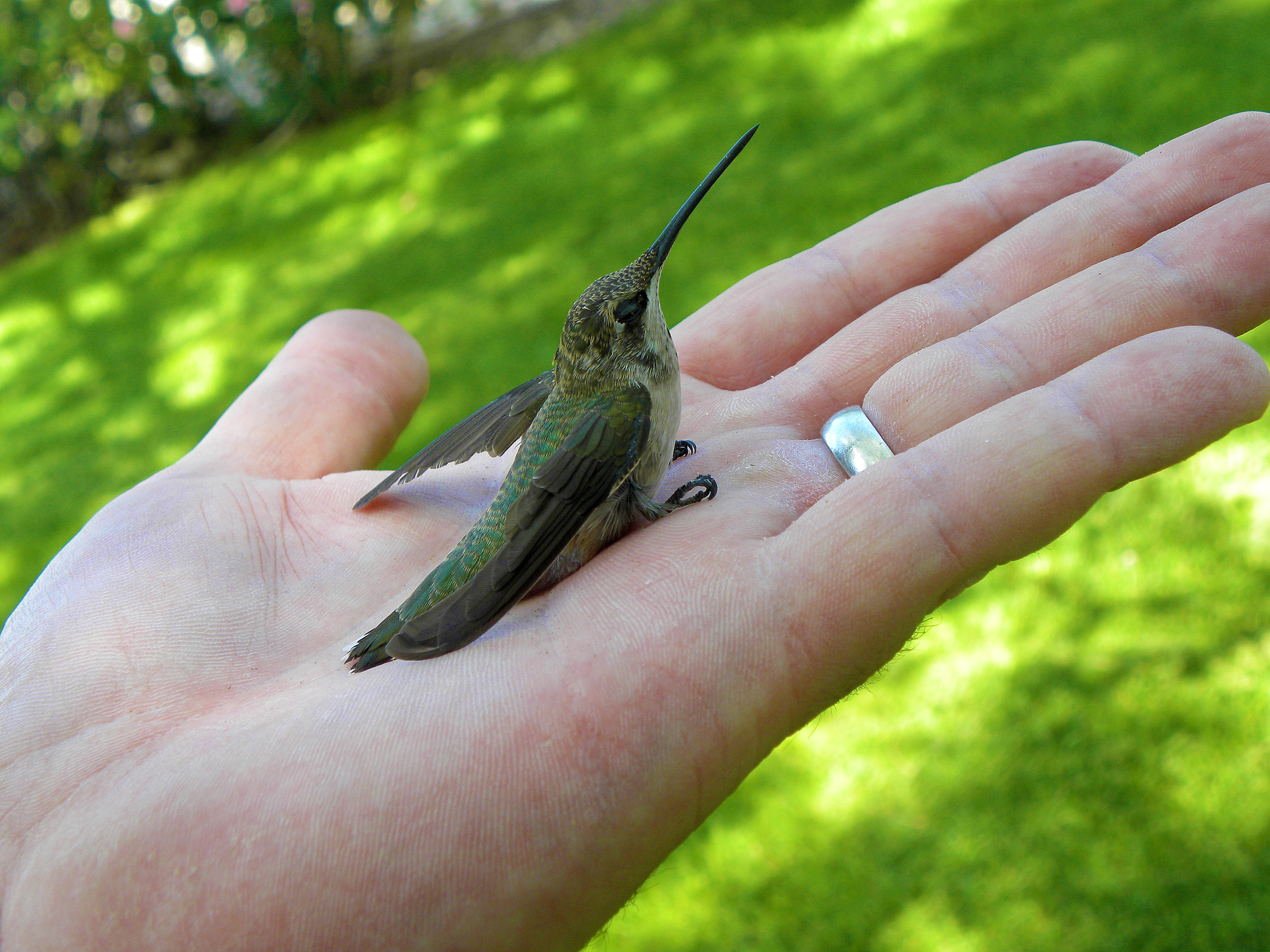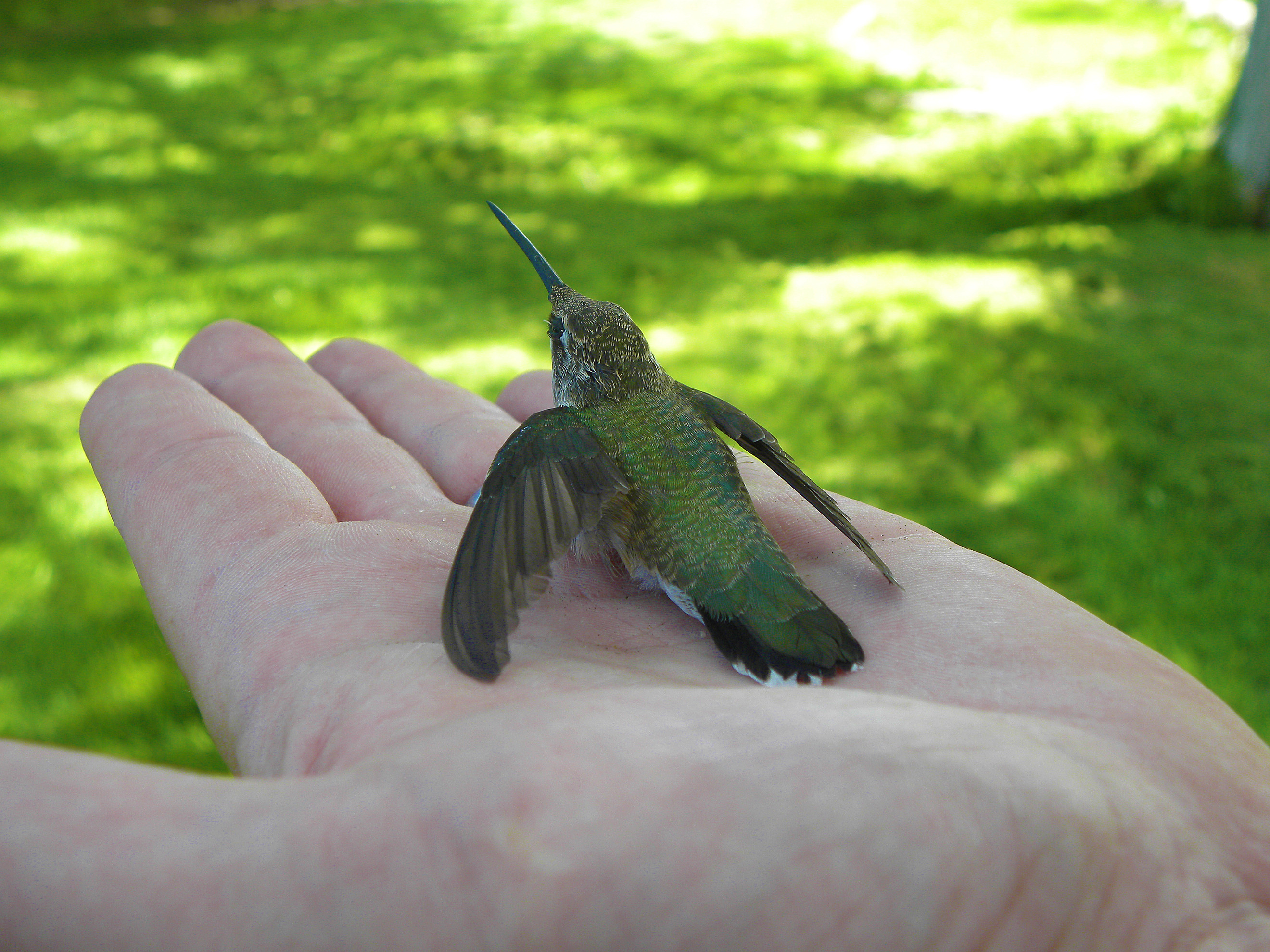 I’m not sure what it is with us and hummingbirds this summer. After watching Harry sputter and land in the hot sun on the ground in the corral, I went over to make sure he was alright. I think Harry was tuckered out from what must have been his maiden flight, because he stepped right onto my finger without a moment’s hesitation.