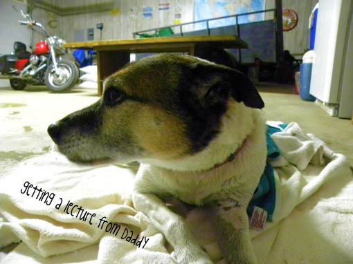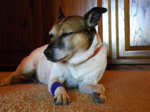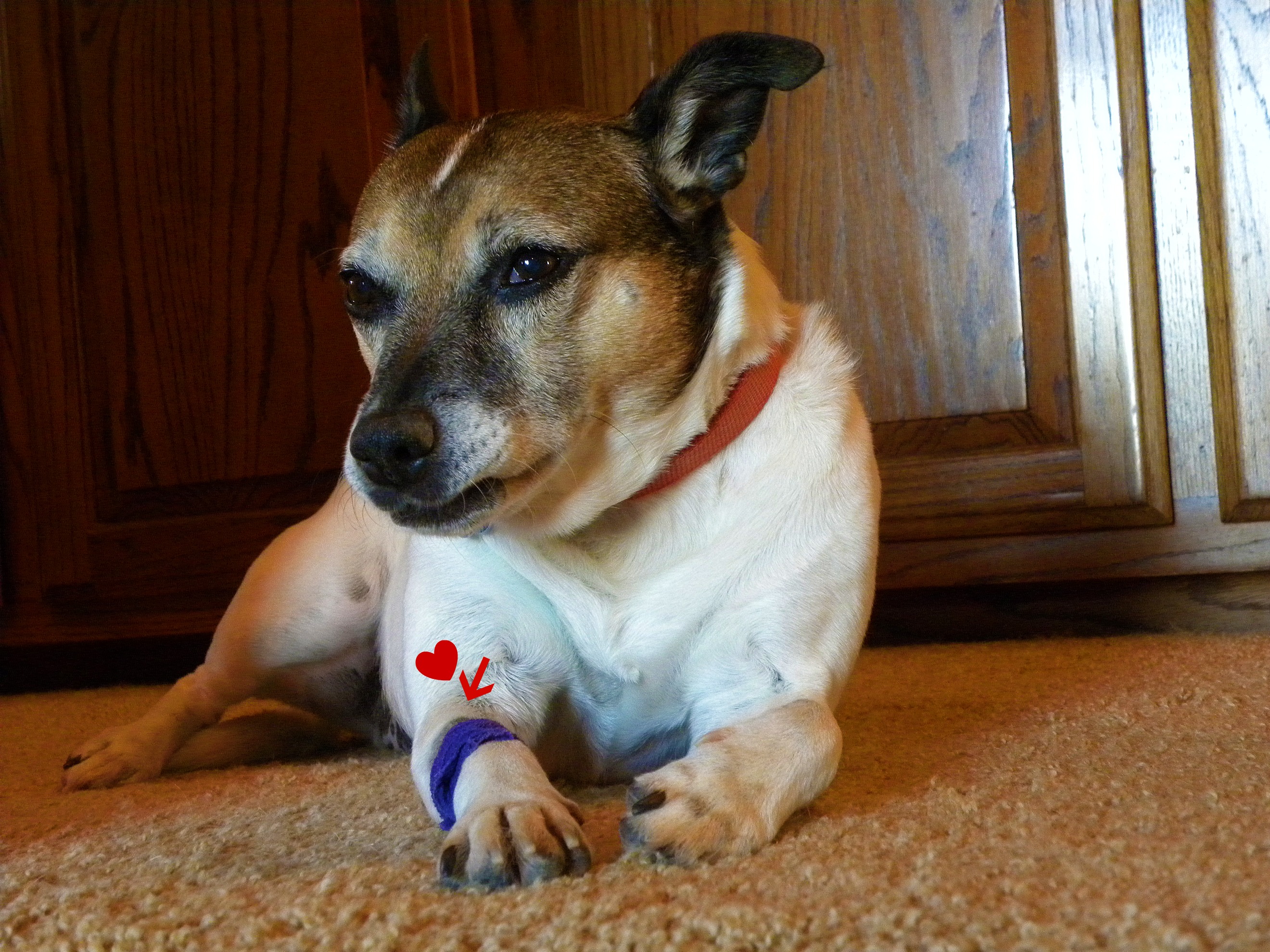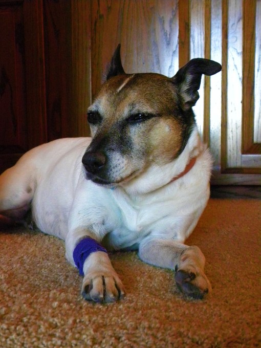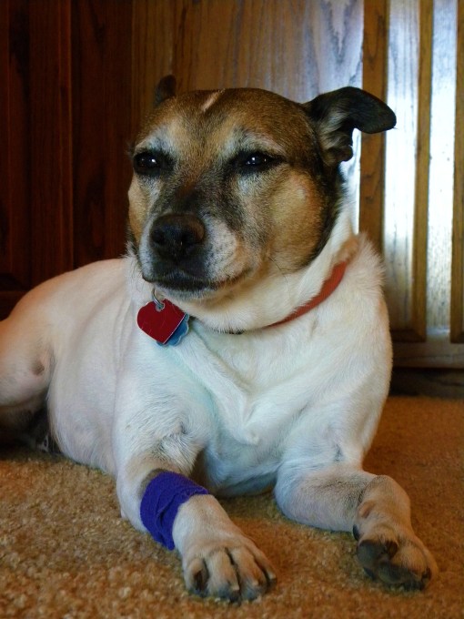 Baby Kassie went to the vet to get her teeth cleaned on Wednesday. She came home Wednesday afternoon with a purple bandage on her leg and two fewer teeth.
